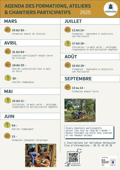 Tu souhaites sculter, modeler des murs en terre et profiter d'une expérience collective à Kerbouzier ? Nous proposons un chantier d'une semaine pour...